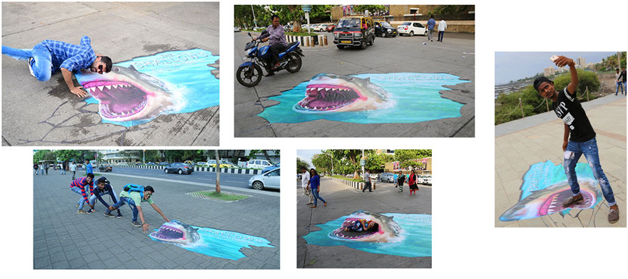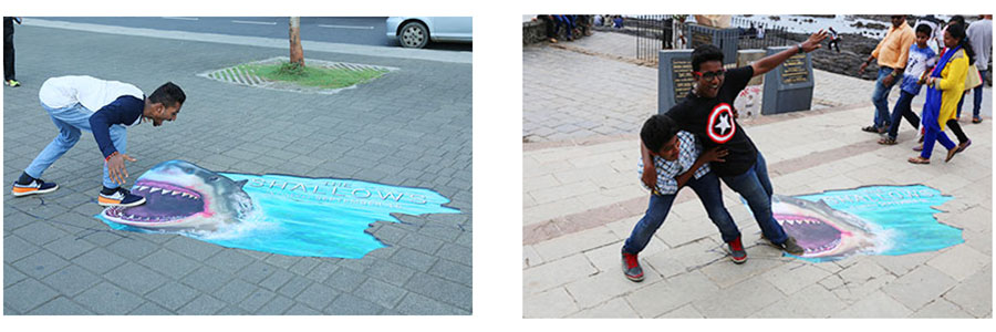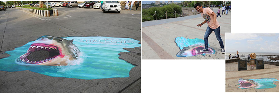 The street art featured a puddle from which the shark from the movie was coming out with it’s jaws open.